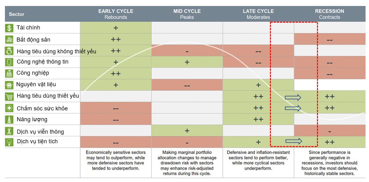 Về luân chuyển nhóm ngành, ông Huy cho rằng các nhóm cổ phiếu mang tính phòng thủ, ít chịu tác động bởi lạm phát, suy thoái kinh tế sẽ có khả năng diễn biến tốt hơn so với thị trường chung. Ở đây ông nhấn mạnh là “diễn biến tốt hơn” chứ không phải chắc chắn có lợi nhuận. Nhiều thời điểm thị trường, ngay cả những nhóm cổ phiếu phòng thủ cũng bị bán. Do đó khi tham gia các cổ phiếu phòng thủ, nhà đầu tư cũng cần quan sát các yếu tố tác động đến thị trường và định thời điểm thị trường để tham gia phù hợp.