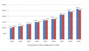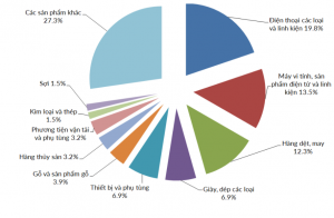 Xuất khẩu và nhập khẩu Tổng kim ngạch xuất nhập khẩu hàng hóa năm 2019 ước tính đạt 516.96 tỉ USD, trong đó kim ngạch xuất khẩu hàng hóa đạt 263.45 tỉ USD, tăng 8.1% so với năm trước. Năm 2019 chứng kiến sự phát triển mạnh mẽ của khu vực kinh tế trong nước trong lĩnh vực xuất khẩu với tốc độ tăng trưởng 17.7%, cao hơn nhiều so với tốc độ tăng trưởng của khu vực đầu tư nước ngoài (4.2%). Cán cân thương mại hàng hóa năm 2019 ước tính là 9.9 tỉ USD thặng dư thương mại, mức cao nhất trong 4 năm liên tiếp về thặng dư thương mại. Xuất khẩu: năm 2019, có 32 mặt hàng có kim ngạch xuất khẩu hơn 1 tỉ USD, chiếm 92.9% tổng kim ngạch xuất khẩu (6 mặt hàng có kim ngạch xuất khẩu trên 10 tỉ USD, chiếm 63.4%), trong đó điện thoại và linh kiện với giá trị xuất khẩu lớn nhất đạt 51.8 tỉ USD, chiếm 19.7% tổng kim ngạch xuất khẩu, tăng 5.3% so với năm trước; điện tử, máy tính và linh kiện đạt 35.6 tỉ USD, tăng 20.4%; dệt may đạt 32.6 tỉ USD, tăng 6.9%; máy móc, thiết bị và dụng cụ đạt 18.3 tỉ USD, tăng 11.9%; giày dép đạt 18.3% tỉ USD, tăng 12.7%; gỗ và sản phẩm gỗ đạt 10.5 tỉ USD, tăng 12.8%. Nhìn chung, tỉ trọng xuất khẩu của một số sản phẩm chính vẫn thuộc về lĩnh vực đầu tư trực tiếp nước ngoài. Nhập khẩu: Trong 2019, tổng kim ngạch nhập khẩu ước tính đạt 253.51 tỉ USD, tăng 7% so với 2018. Trong đó khu vực kinh tế trong nước đạt 108.01 tỉ USD, tăng 13.8%; khu vực đầu tư nước ngoài đạt 145.50 tỉ USD, tăng 2.5%. |